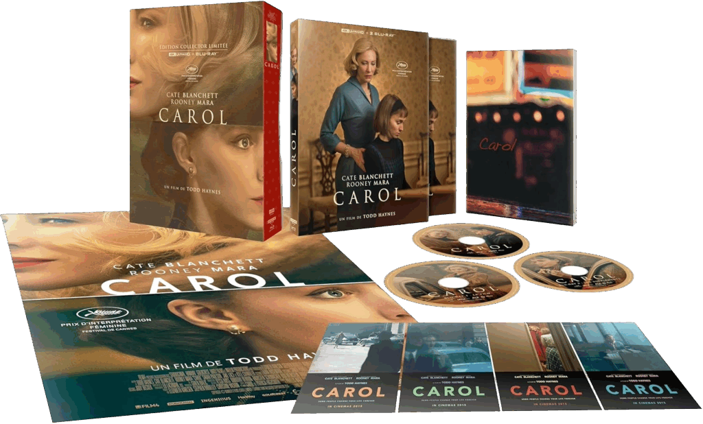 Carol est disponible en coffret limité chez Bubbel Pop’ proposant un disque 4K contenant le film en UHD, son pendant au format Blu-ray accompagné des bonus récupérés de la précédente édition, un Blu-ray de nouveaux suppléments très complets (contenant des heures d’interviews de personnes impliquées dans la genèse du film), ainsi que différents documents papier, dont un livre de 100 pages. A noter qu’une édition exclusive aux magasins FNAC propose en plus le vinyle de la bande originale du film, signée par Carter Burwell.